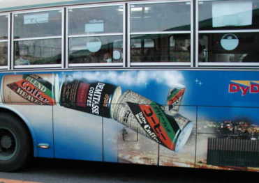 缶コーヒーなど飲料関連ラッピング広告バス
