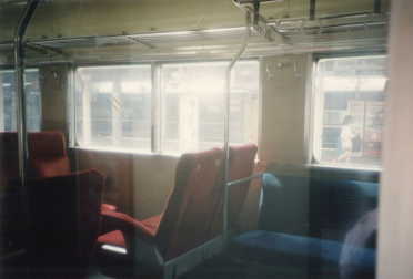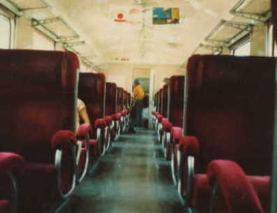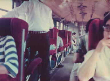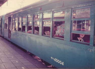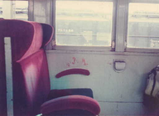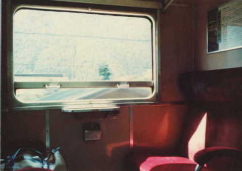 1978年 大糸線 サハ45004 座席は戦後 復興の二代目のはず。 座席のふとん だけ青モケ ットに交換 されていた。 左下参照 |