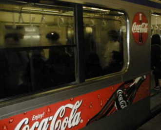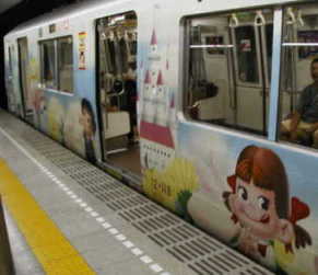 左は都営地下鉄 大江戸線 不二家ぺこちゃん 一応飲料系に 含めます。 2002年秋 右は盛岡地区のJR 普通電車2001年11月 みちのくコカコーラ |