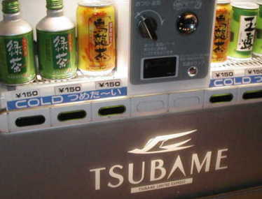 特急つばめの自販機 です。主な運転区間 は博多・西鹿児島 2003年11月撮影 緑茶は子会社ジェイア ール九州リーテール。 烏龍茶は興南物産 ボアビスタ(熊本市) |